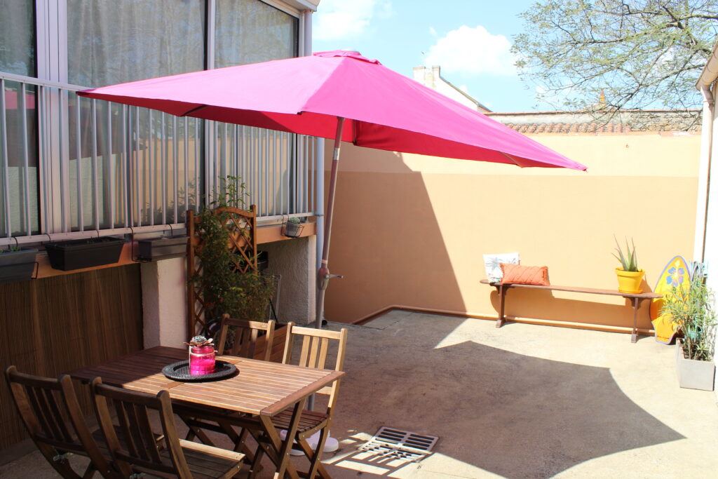 Dans une cour privée, une petite maisonnette rénovée en 2023, comprenant une cuisine, une pièce à vivre, une grande chambre avec lit d’1 m60 et salle d’eau. Une grande terrasse fleurie avec table de jardin et salon pour se détendre après la plage.