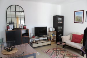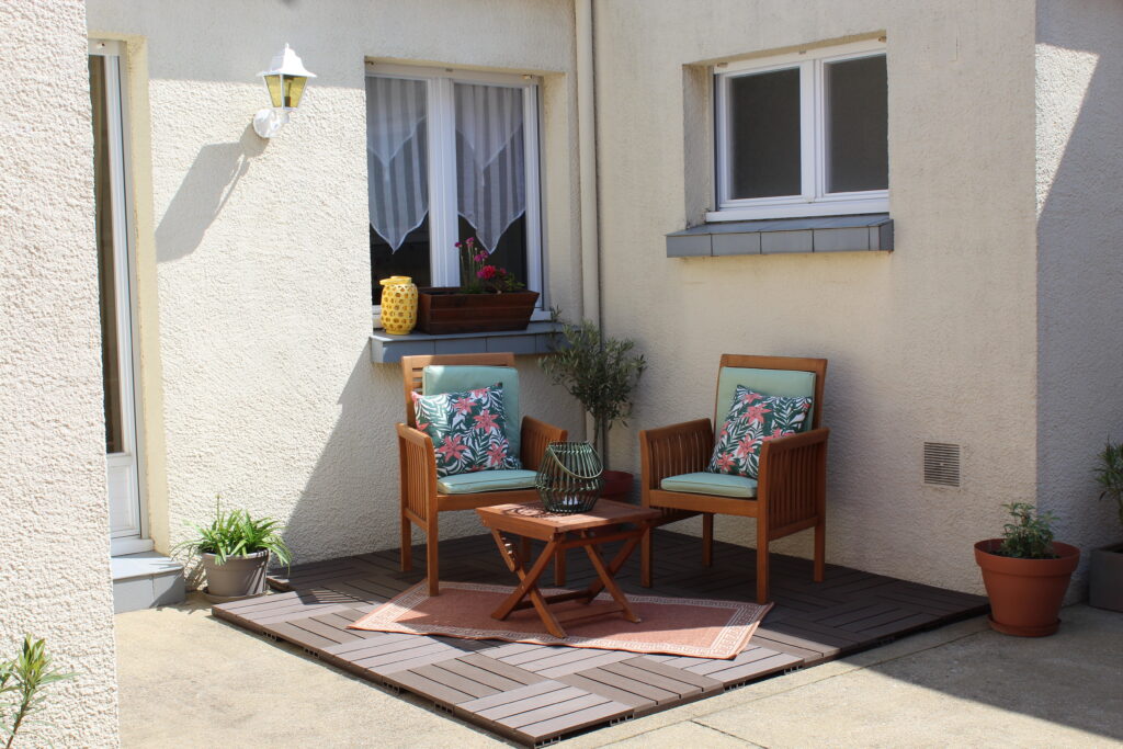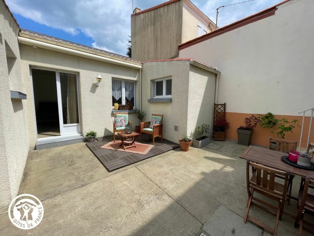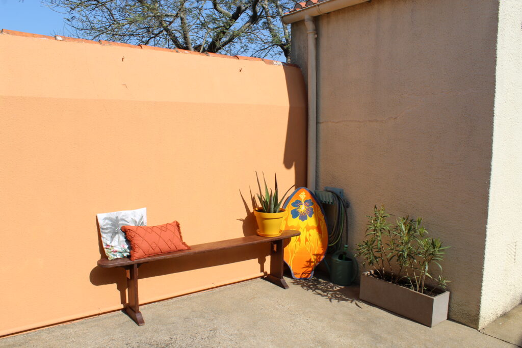 Dans une cour privée, une petite maisonnette rénovée en 2023, comprenant une cuisine, une pièce à vivre, une grande chambre avec lit d’1 m60 et salle d’eau. Une grande terrasse fleurie avec table de jardin et salon pour se détendre après la plage.